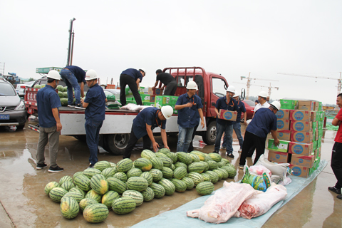 同时,金汇江一行为一线干部员工送去猪肉、西瓜、矿泉水、绿茶、绿豆、白糖等慰问品。